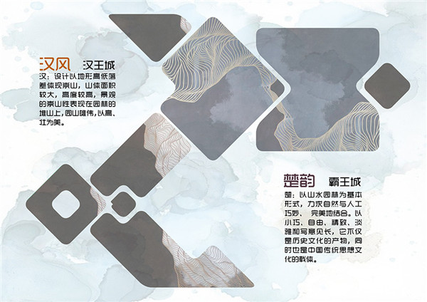 汉:设计以地形高低落差体现崇山,山体面积较大,高度较高,景观的崇山性表现在园林的堆山上,园山雄伟,以高、壮为美。
